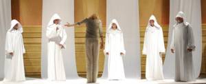 Caprica Three stands before...the five unseen models? [Looks like Three is getting judged for what she's been up to.]