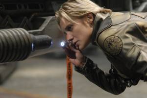 3/1/07: Kara sits by her Viper. She doesn't look well at all. Lee and Tyrol talk about how she's still there. Lee tells him to talk to Kara. Tyrol tells Lee to talk to her. | Lee sits down next to Kara. After sitting in silence for a few moments, she asks him if he's, "feeling sorry" for her. Lee answers that everyone gets rattled, even the best. She tells him that she's "not going back out there. because she doesn't trust" herself. He tells her to trust him and he'll fly her wing. She scoffs at the idea of the CAG flying as a No. 2. He looks right at her and says, "Whatever it takes." She asks how things are going with Dee. He mumbles that they are, "you know, good." He then adds that they are the best that they have ever been. Kara says that she's happy for him and that she really means it. She then points out that they are right back where they started [in the miniseries] where's he's CAG and she's his troublesome hotshot pilot. She adds that is all they'll ever be. Lee just looks at her. From AOL Preview
